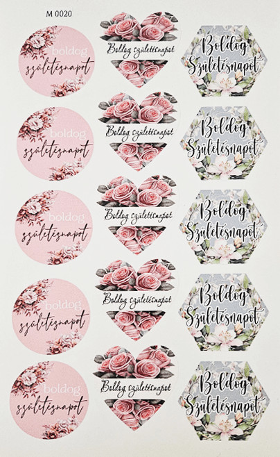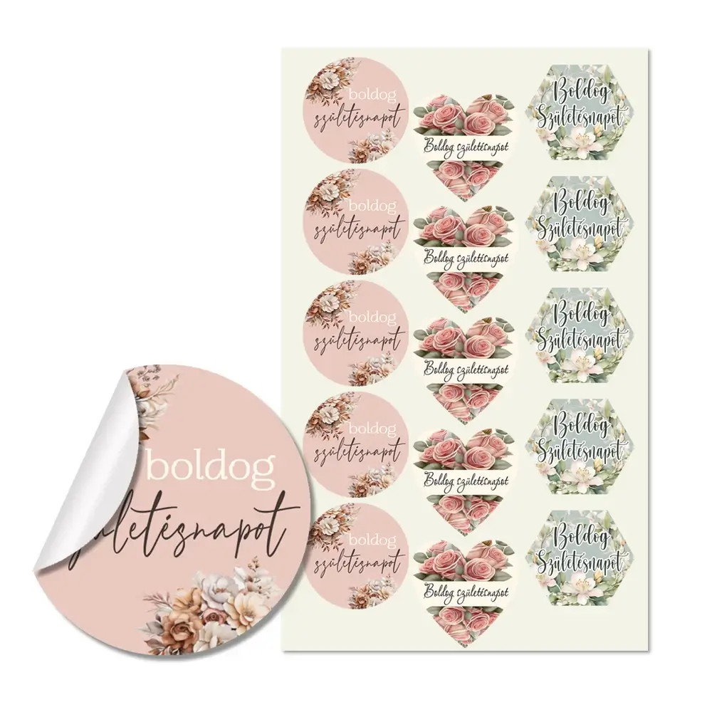 Ajándékkísérő matrica, "Boldog születésnapot", 15 db/ív. Szakadásmentes és vízálló. Méret: 4-4,5cm. Ív mérete 15x25cm.