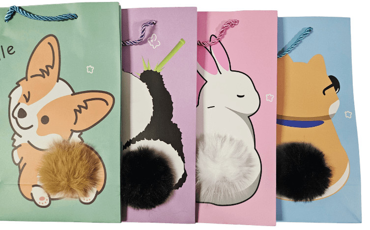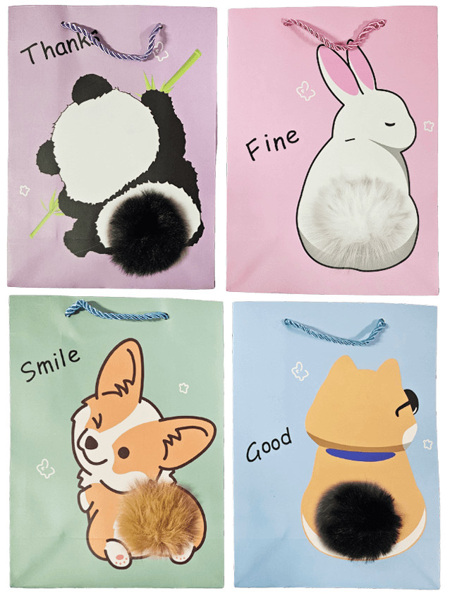 Állatos ajándéktáska pamacsos díszítéssel 23x18x10cm, közepes, többféle. A pamacs szörmés kialakítású. Az ár egy darabra vonatkozik, nem biztos, hogy mindegyik van raktáron.