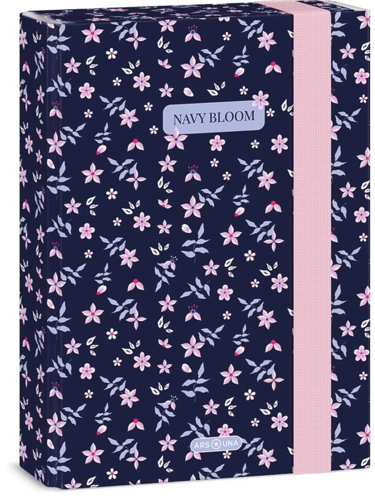 Ars Una füzetbox A/5, Navy Bloom, sötétkék, virágos. A/5 méretű füzetbox. Kemény, tartós kartonból, 4 cm-es gerinccel, fényes fóliával, 7 mm széles gumipánttal. Belseje egy színnel nyomott. Füzetek, iratok tárolására . Méret: 220mm x 160mm x 35mm