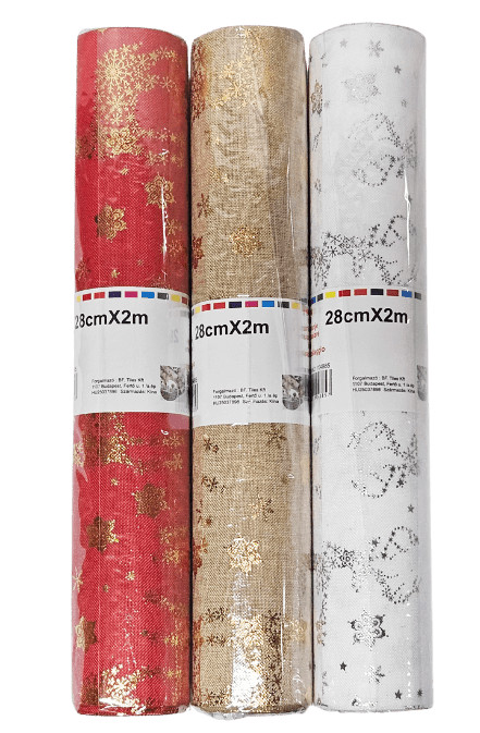 Asztali futó, asztalközép 28 cm x 2m, karácsonyi, többféle változat. Az ár egy ívre vonatkozik. Ajándékcsomagolásra is alkalmas. Organza jellegű.