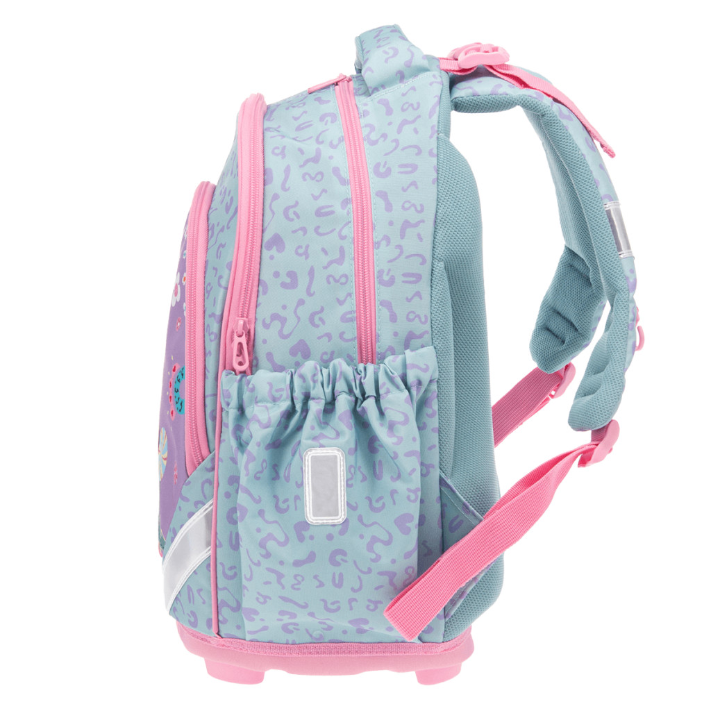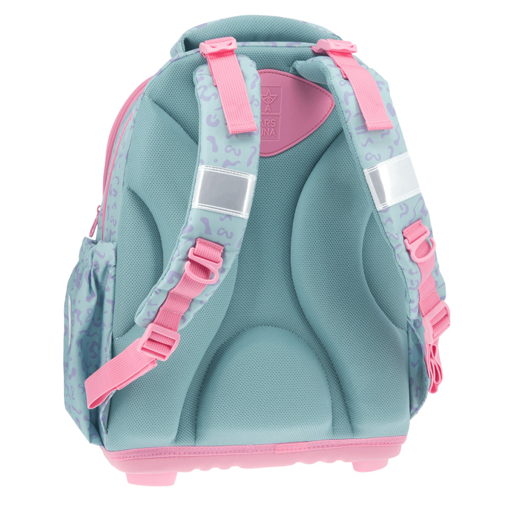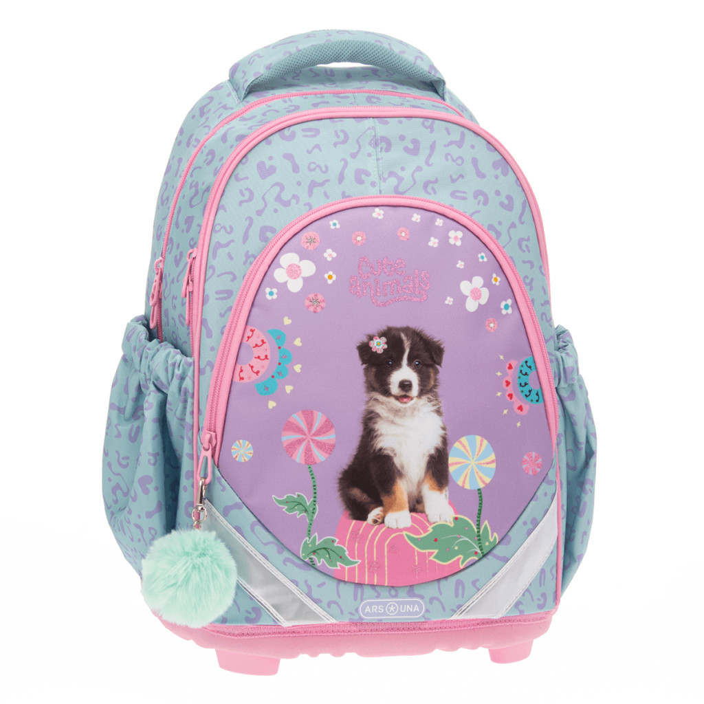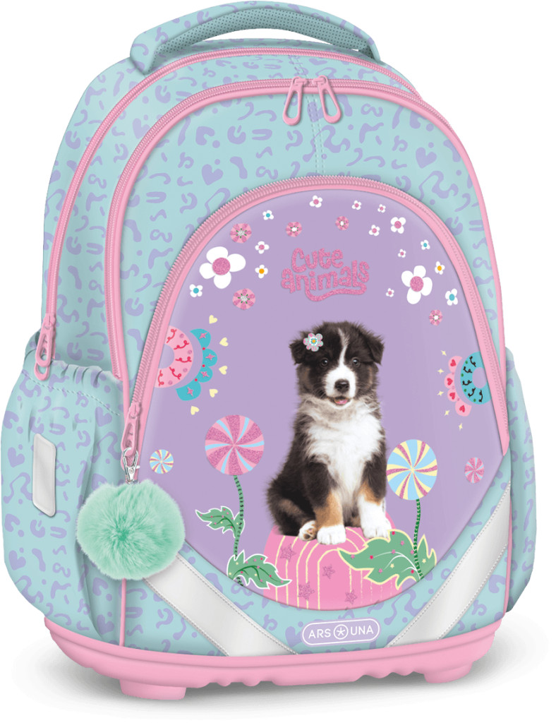 Aussie, kutyás anatómiai iskolatáska, hátizsák, 43x33x22cm, Ars Una,CUTE Ars Una, Aussie, kutyás. Hátizsák formájú iskolatáska, amely ideális kisiskolásoknak. Ergonómikus kialakítású, szellőztető barázdákkal teli és műanyag merevítésű hátkiképzéssel. Puha, méretre állítható vállpántokkal, amelyekekkel szabályozható, hogy mennyire álljon feszesen a gyerek hátához simulva a táska. A hátizsák három nagy cipzáras rekesszel rendelkezik,az elsőben toll- és igazolvány tartó rekesz található. Oldalán két gumis zsebbel a kulacs részére. Alja tartós és kemény textillel bevont műanyag. Nagy felületű fényvisszaverő elemekkel elől, oldalt és a vállpántokon. Tetején fogantyúval. Ajándék pompom a táskához.