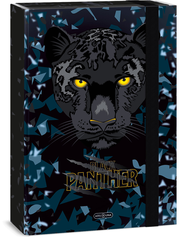 Black Panther füzetbox A/4, Ars Una, fekete párduc. A/4 méretű füzetbox. Kemény, tartós kartonból, 4 cm-es gerinccel, fényes fóliával, 7 mm széles gumipánttal. Belseje egy színnel nyomott. Füzetek, iratok tárolására.
