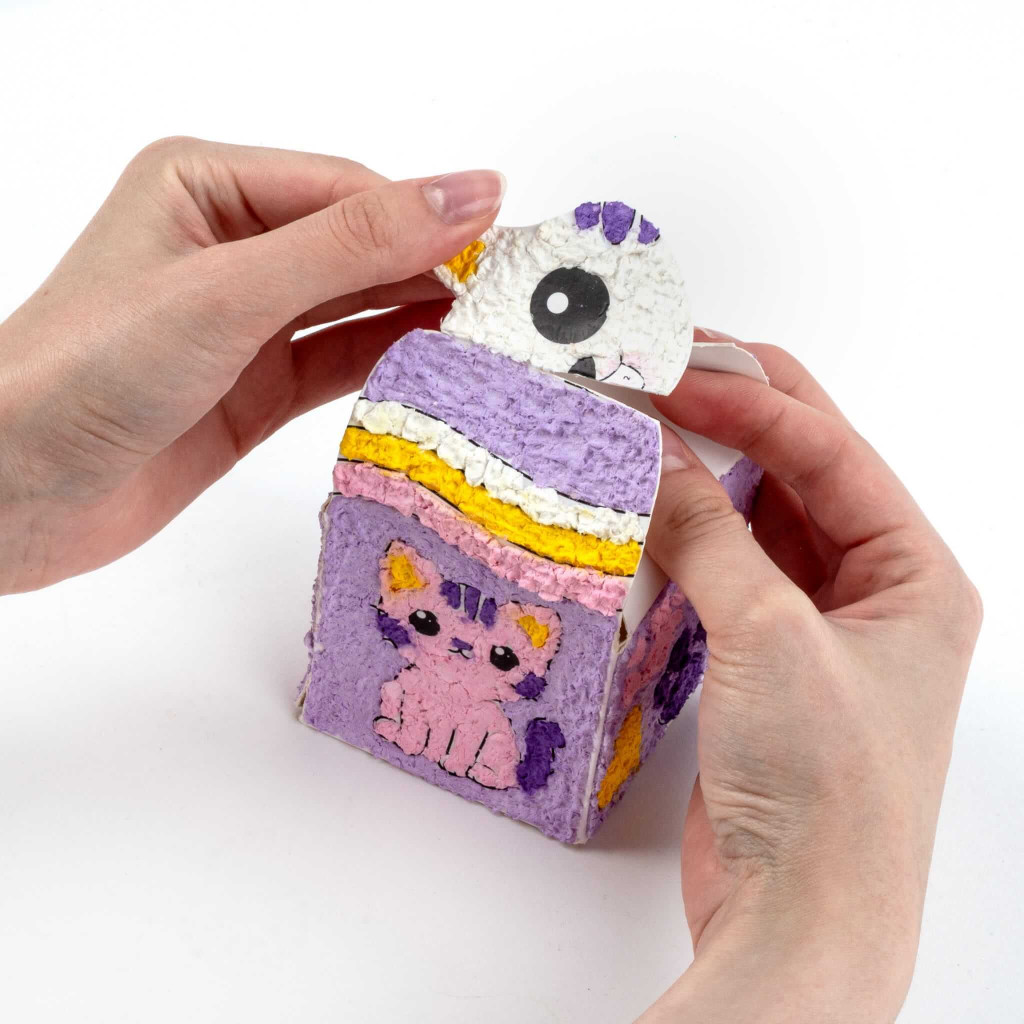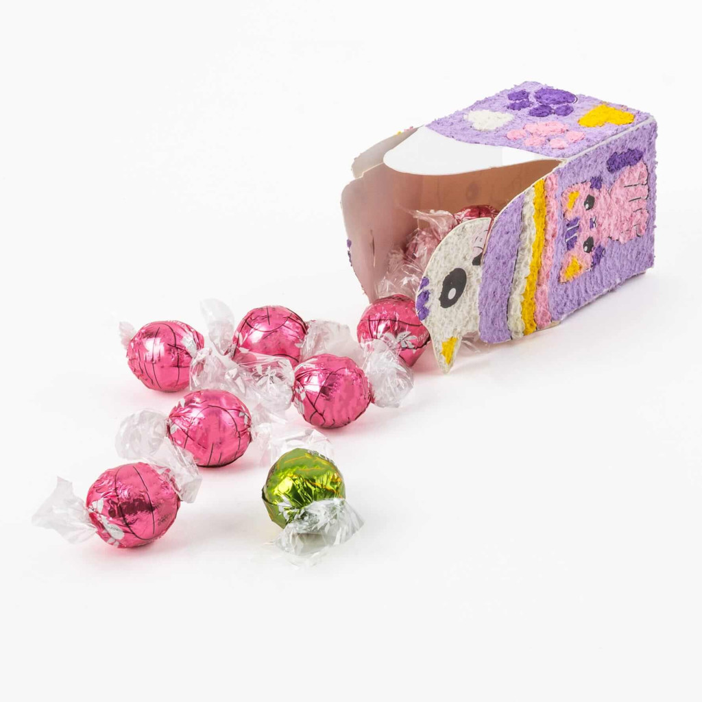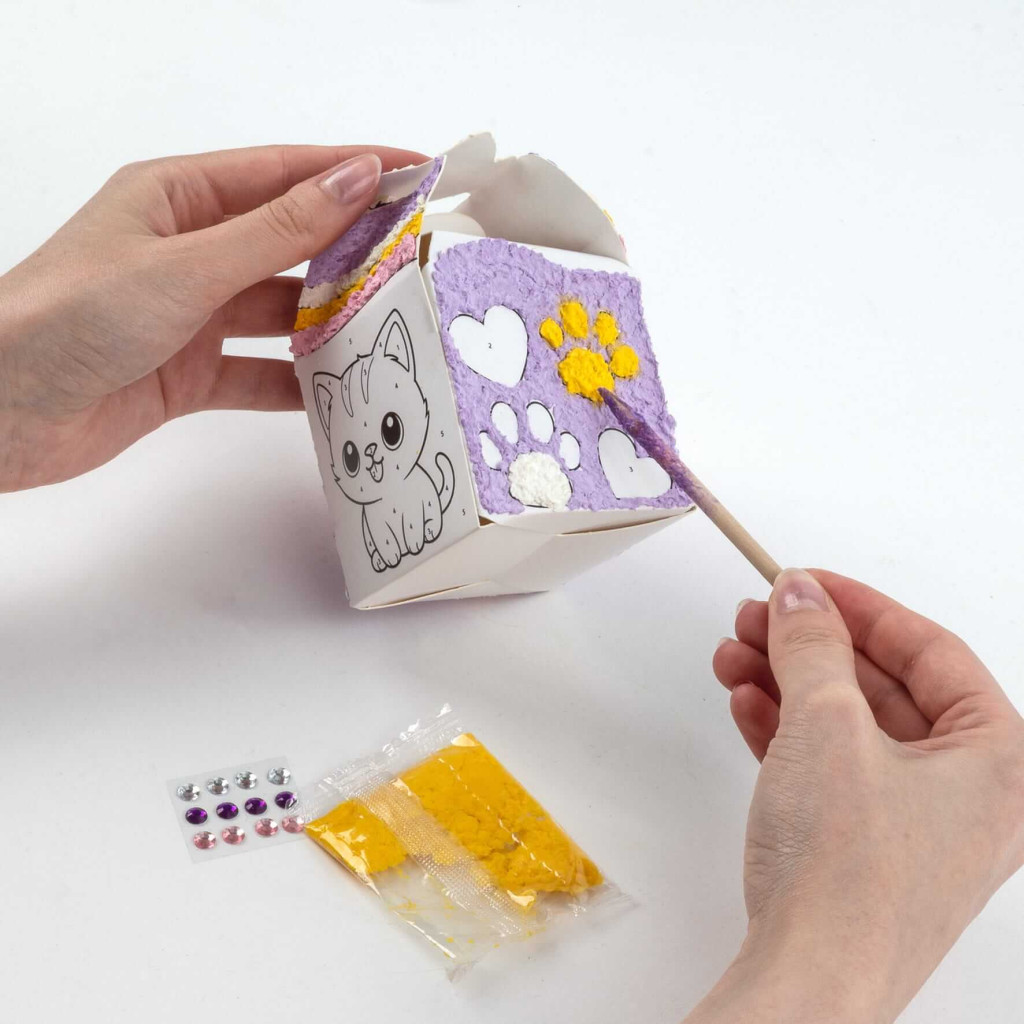 A készlet 5 különböző színű papírmasét tartalmat, amelyekkel a sablonon található számokat követve feldíszítheted a dobozt. Nagyobb területeken használd az ujjaidat, a finomabb részletekhez pedig a pálcikát.