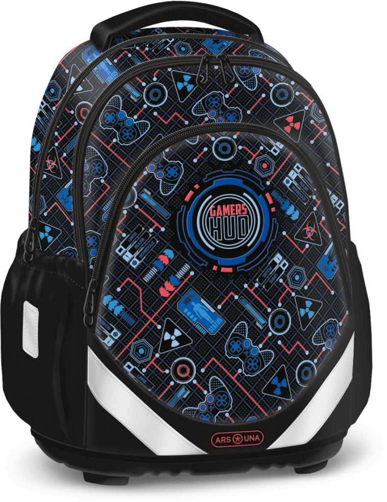 Gamers Hud anatómiai iskolatáska, hátizsák, 43x33x22cm, Ars Una. Hátizsák formájú iskolatáska, amely ideális kisiskolásoknak. Ergonómikus kialakítású, szellőztető barázdákkal teli és műanyag merevítésű hátkiképzéssel. Puha, méretre állítható vállpántokkal, amelyekekkel szabályozható, hogy mennyire álljon feszesen a gyerek hátához simulva a táska. A hátizsák három nagy cipzáras rekesszel rendelkezik,az elsőben toll- és igazolvány tartó rekesz található. Oldalán két gumis zsebbel a kulacs részére. Alja tartós és kemény textillel bevont műanyag. Nagy felületű fényvisszaverő elemekkel elől, oldalt és a vállpántokon. Tetején fogantyúval. Ajándék pompom a táskához.