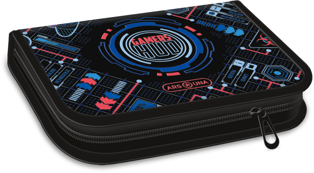 Gamers Hud tolltartó, klapnis, töltött, Ars Una. Írószerekkel töltött cipzáros tolltartó két kihajtható füllel, gumis kialakítással az írószerek tárolásához. Tartalma: 12 db színes ceruza, 3 db HB grafit ceruza, 1 vékony és 1 vastag postairón, 8 db színes filctoll, 1 db radír, 1 db hegyező, 1 db 17 cm-es egyenes vonalzó, 1 db háromszög vonalzó, órarend A és B hétre. Méret: 193mm x 128mm x 36mm