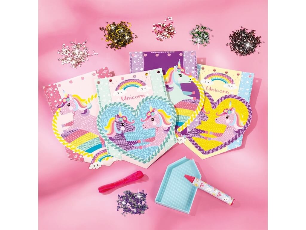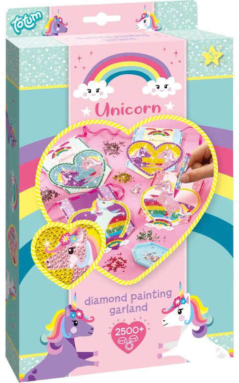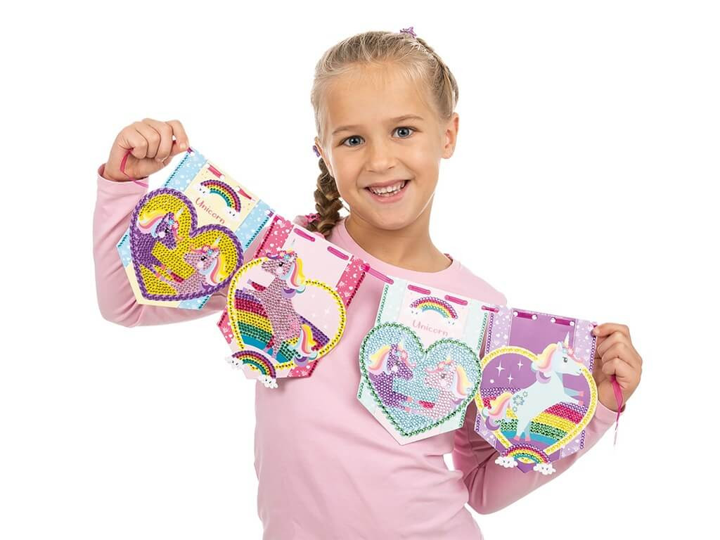 Gyémántfestés szett, Unikornis füzér 4 mintával. Csomagolás mérete: 18x30,5x3,5cm. A Totum Unikornis zászlókészítő készlet apró színes köveket, és szíves mintájú, egyszarvúkat ábrázoló kártyákat tartalmaz, amiket egy szalagra tudsz felfűzni.Ha elkészült a zászló, akaszd fel, díszítsd vele a szobádat, akár bulikra, összejövetelekre is. Az Unikornis csillám zászló készítő készlet tartalma: 4 darab unikornis kártya, 1500 darab csillámos kő, 1 méter szalag, tálca, applikáló toll.