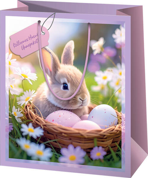 Húsvéti ajándéktáska 14x11x6cm, kicsi, lila, nyuszi tojásokkal egy kosárban