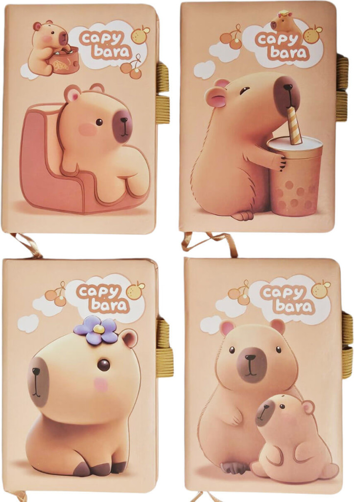 Kapibara napló gumis tolltartóval, A/6, többféle változat. Az ár egy darabra vonatkozik, nem biztos, hogy mindegyik van készleten.