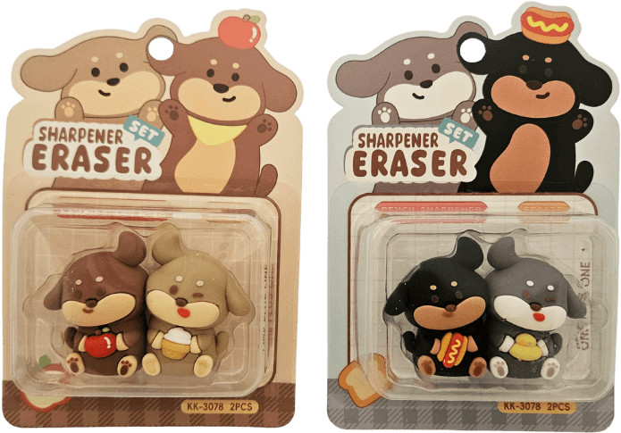 Állatos radír és hegyező, 2 kutyus, 2 féle változat. Egy csomag egy radírt és egy hegyezőt tartalmaz. Az ár egy szettre vonatkozik, nem biztos, hogy mindkettő változat van készleten.