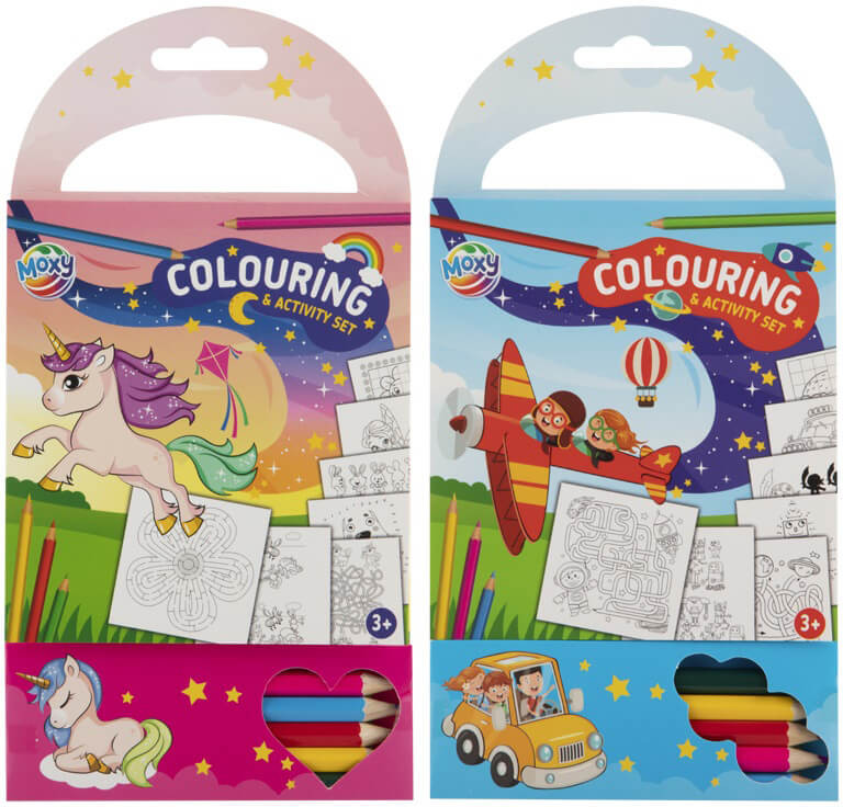 Mini foglalkoztató- és színezőfüzet, útikönyv, 11x22cm, 60 lap, 5 ceruza, kétféle változat.