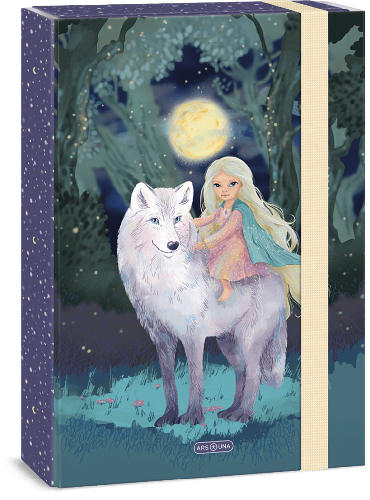 Northern Lights füzetbox A/4, Ars Una, farkas kislánnyal. A/4 méretű füzetbox. Kemény, tartós kartonból, 4 cm-es gerinccel, fényes fóliával, 7 mm széles gumipánttal. Belseje egy színnel nyomott. Füzetek, iratok tárolására.