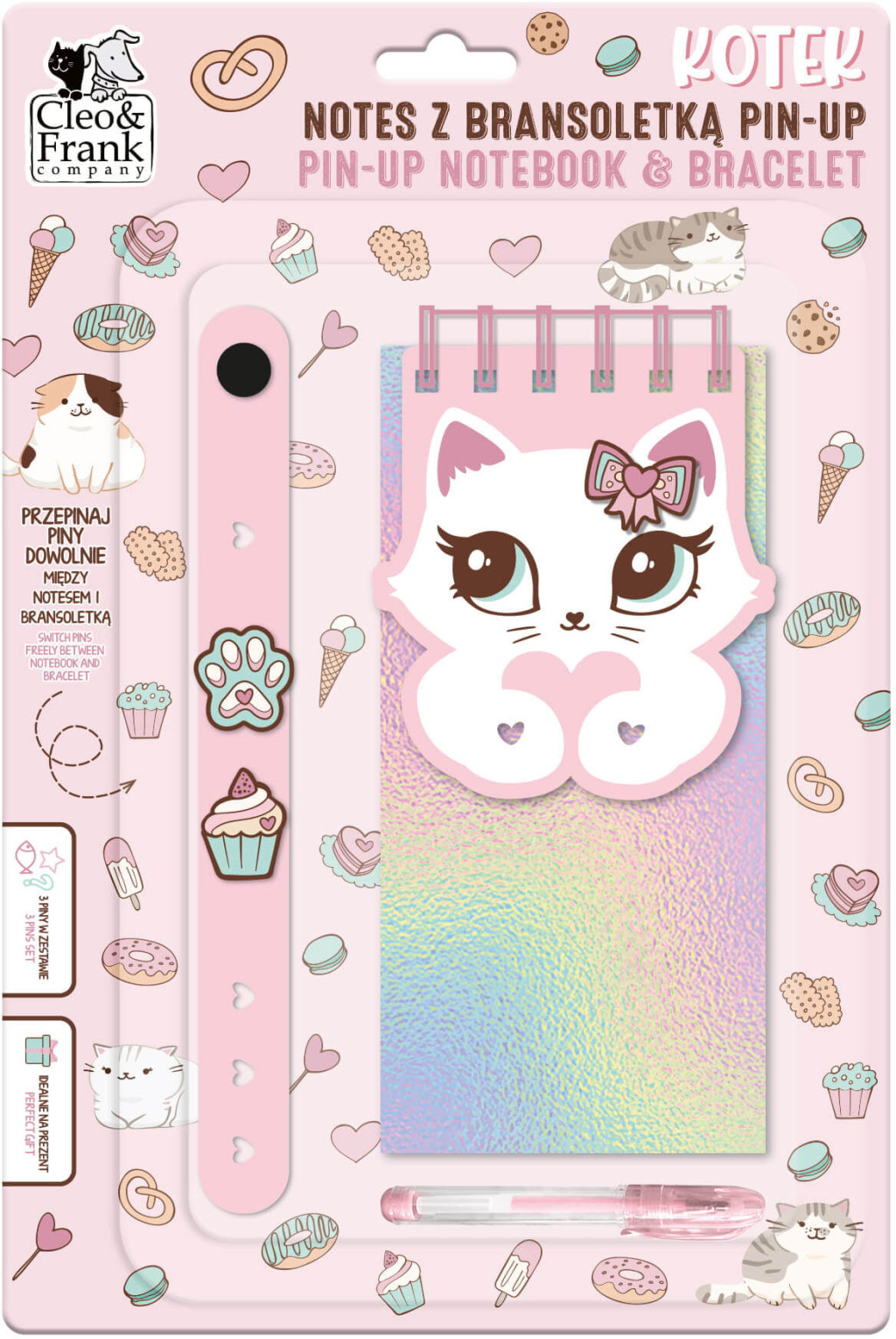 Spirálfüzet igazi macskarajongóknak! A készlet tartalmaz egy műanyag karkötőt, egy jegyzetfüzetet (8,5x17,5cm), egy tollat ​​és három díszítő formát. Mind a jegyzetfüzet borítóján, mind a karkötőn külön helyek találhatók a díszeknek. A charmokat szabadon cserélgetheted a jegyzetfüzet és a karkötő között, hogy saját, egyedi kompozíciókat készíthess. Ez a készlet tökéletes ajándék a cicák és a színes kiegészítőik szerelmeseinek. A jegyzetfüzet belseje sima oldalakat tartalmaz, amelyek tökéletesek jegyzeteléshez, vázlatkészítéshez vagy fontos információk feljegyzéséhez.