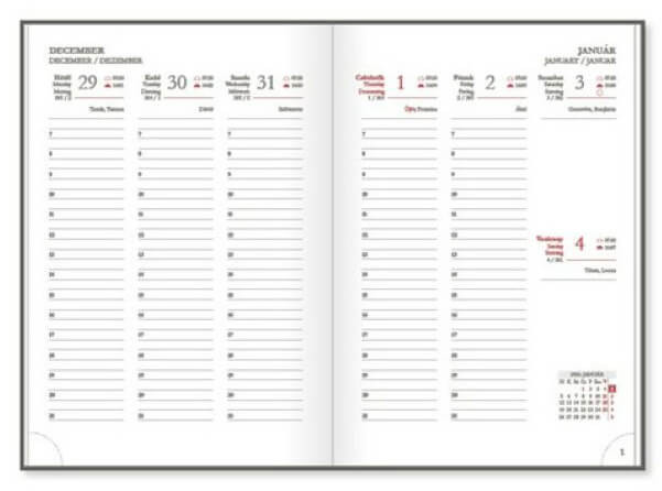 terjedelem: 352 oldal (16 információs oldal, 320 naptároldal, jegyzetek, telefonregiszter)