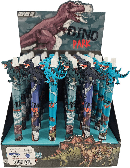 Radírozható zseléstoll, nyomógombos, 0,5mm, dínós (HZ-1612). A toll speciális tintája a tollvéggel radírozható, de az írás -18 C alatt újra előhívható. Írásszín: kék. Az ár 1 db-ra vonatkozik, viszonteladók vegyesen kapják.