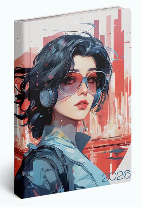 Átlátszó műanyag tokba helyezett agenda, golyóstoll tartóval és névjegytartóval. Heti beosztású, 160 oldalas. Extrák: jelzőszalag, sarokperforálás. Méret: 11,5x16,5cm