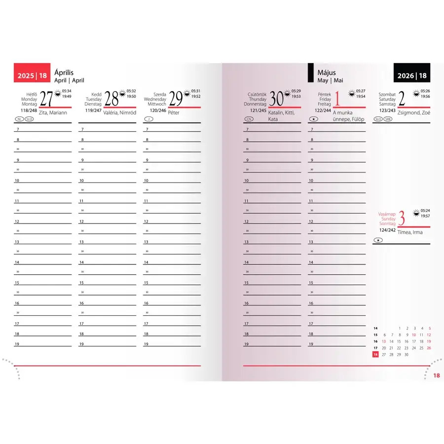 3D-lakkal felületnemesített, kemény táblával, lekerekített sarkokkal és színes gumiszalaggal biztosított zsebnaptár. Heti beosztású, 160 oldalas. Extrák: jelzőszalag, sarokperforálás. Méret: 11,5x16,5cm