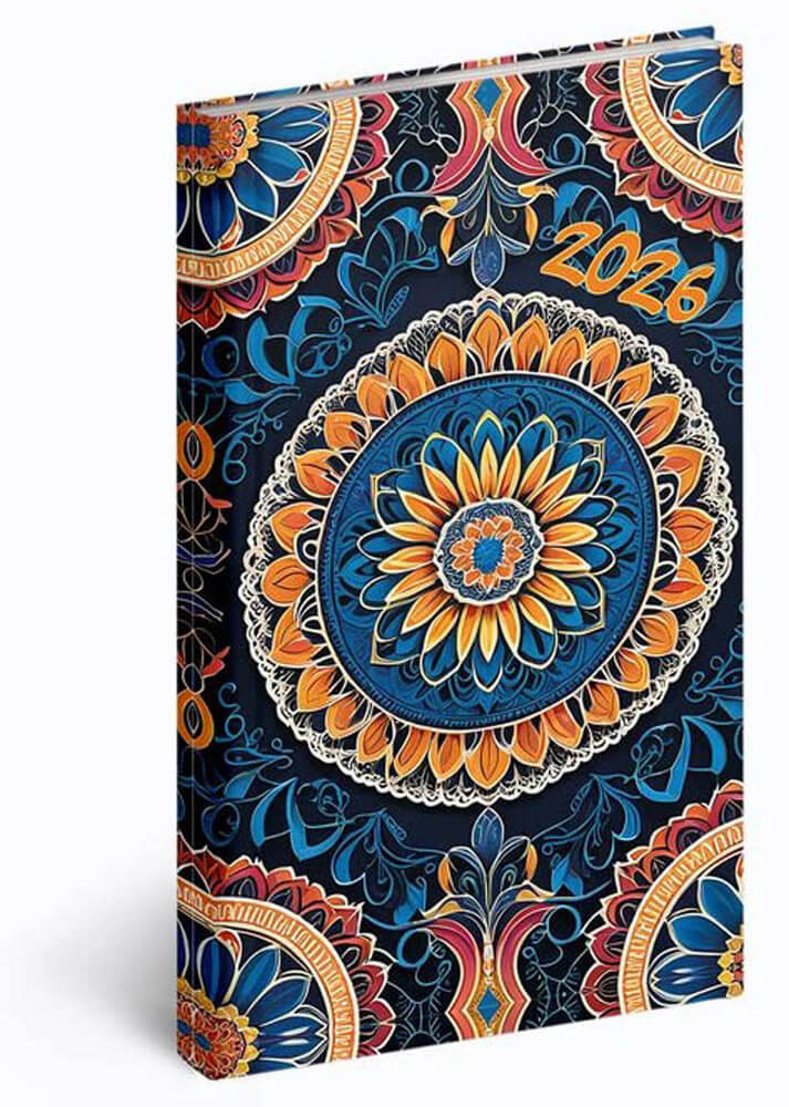 Realsystem zsebnaptár, álló, heti, 9x16,5cm, 2026, Picture mandala. Különböző felületnemesítéssel, illetve fóliával bevont papírborító. Heti beosztású, 144 oldalas, 13 hónapos. Extrák: sarokperforálás.