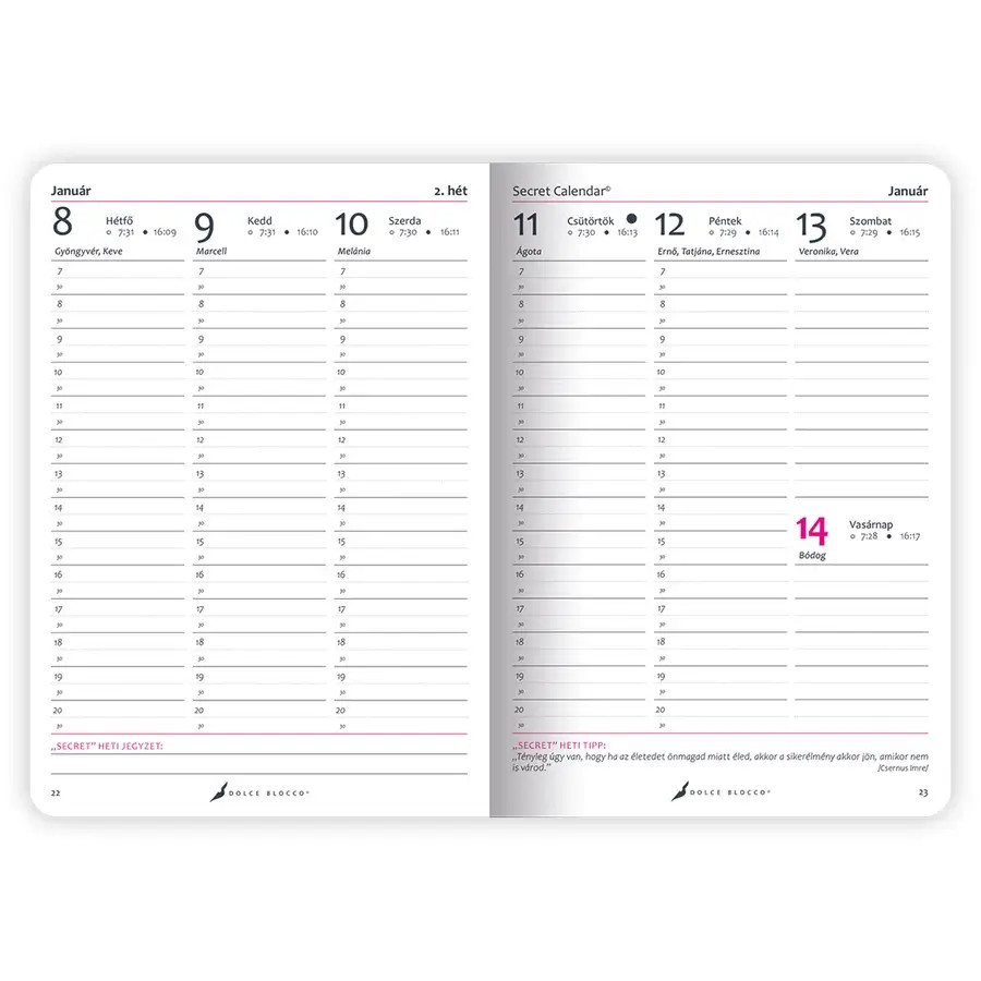A Secret Calendar - az egyik legkedveltebb női határidőnapló ma Magyarországon! Heti tervező, kinyitva az egész heted látod egyben. B6 méretben készül, azaz 12 cm széles és 17 cm magas. Elég nagy ahhoz, hogy minden fontos dolog beleférjen. 192 oldalas.