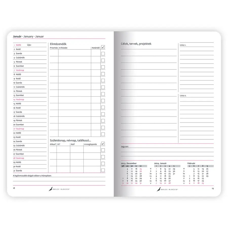 A Secret Planner heti tervező határidőnapló, azaz kinyitva az egész heted látod egyben. A tervezőben hatalmas teret kap az egyéni jegyzetelés lehetősége. Picit nagyobb mint a Calendar, azaz 13 cm széles és 20 cm magas. Minden hónap előtt havi tervezőt találsz. Éves előtervező, Negyedéves havi áttekintő, Névnapok, Menzi naptár, utazástervező és jegyzetlapok találhatók benne.