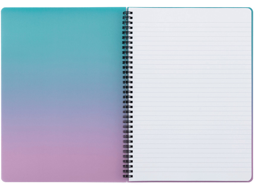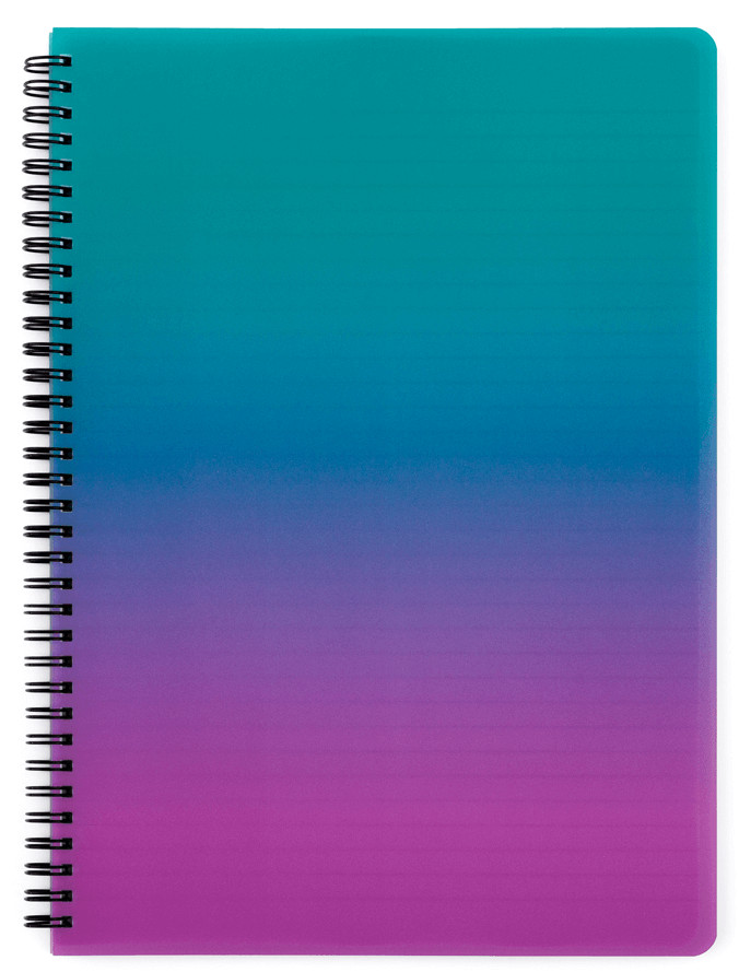 Spirál füzet A/4, vonalas, 60 lapos, műanyag borítóval, OMBRE, türkiz-rózsaszín. Perforált lapok. Méret: 225x300x8mm. Lapok: 70g/m2. Borító anyaga: polypropylen.