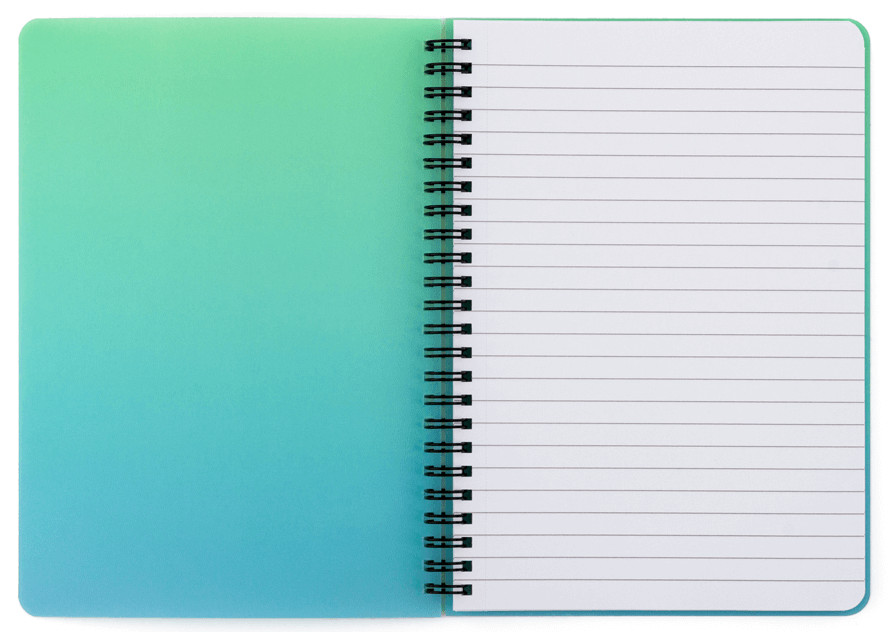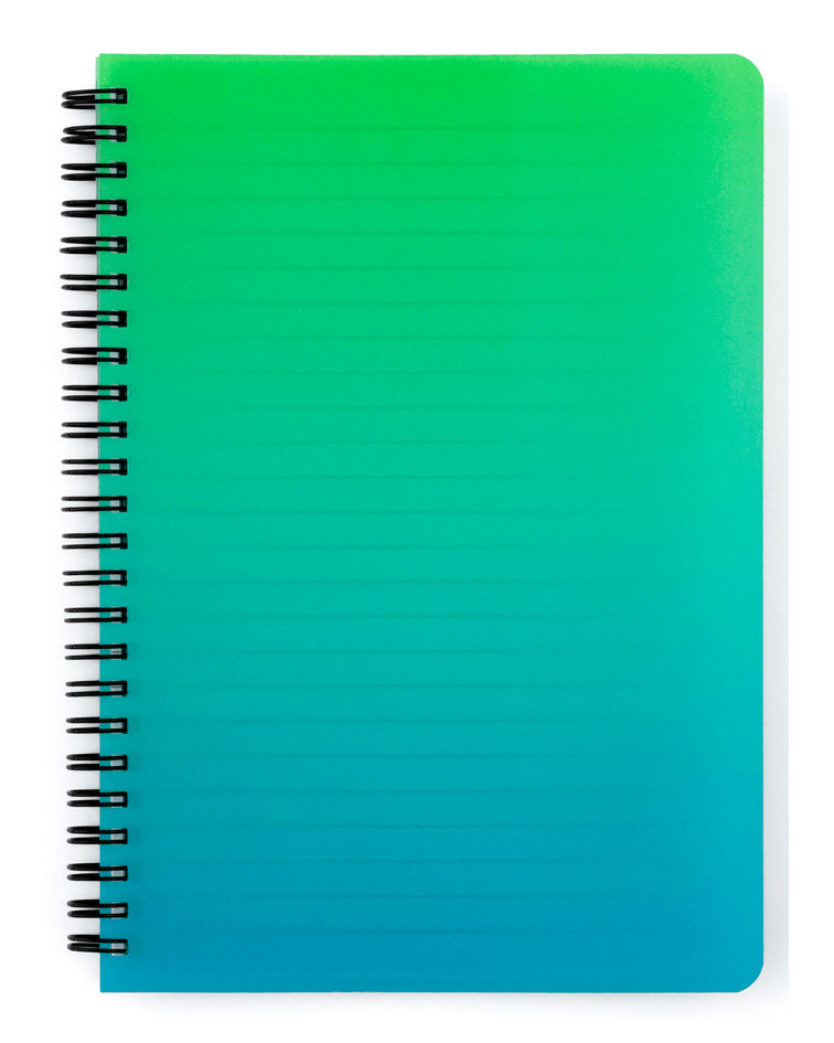 Spirál füzet A/5, vonalas, 60 lapos, műanyag borítóval, OMBRE, zöld-kék. Perforált lapok. Méret: 165x215x8mm. Borító anyaga PVC.