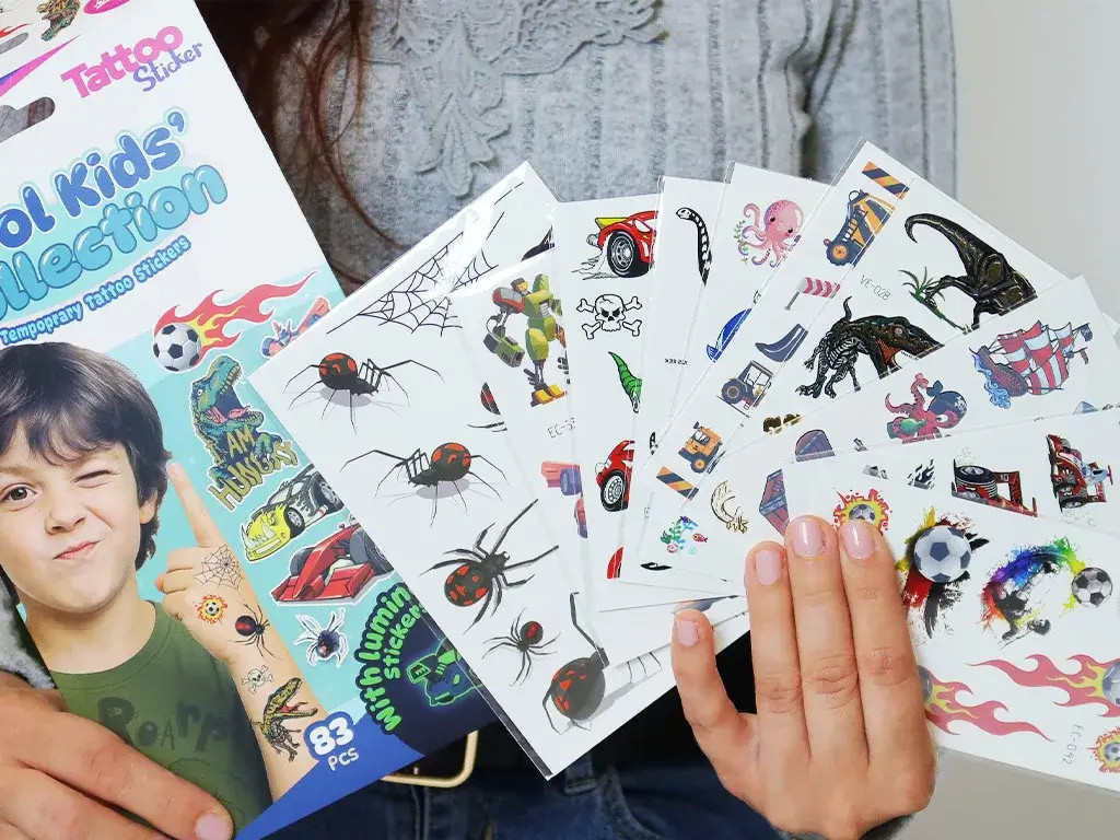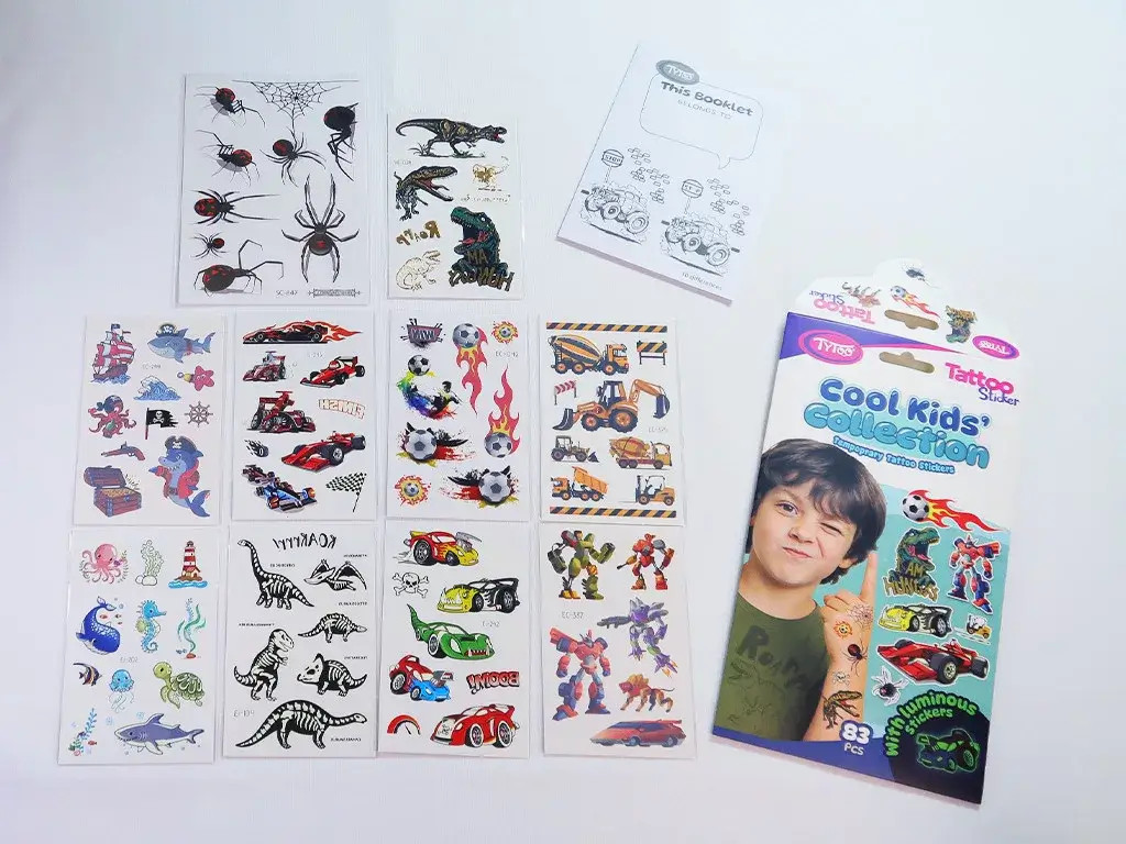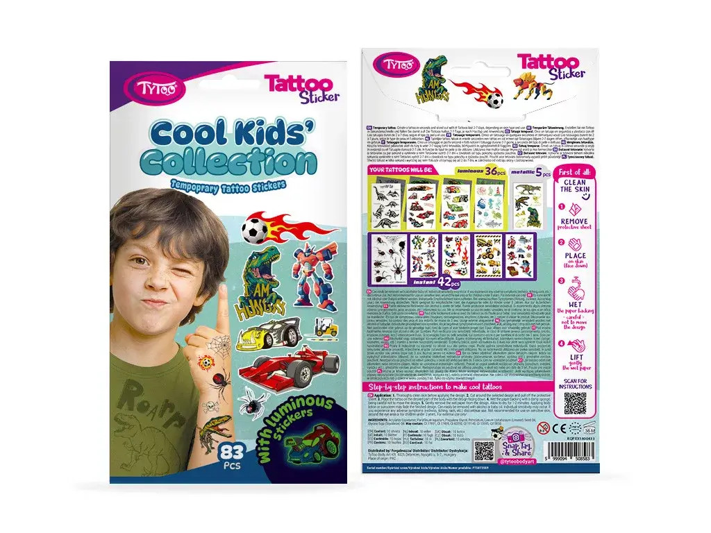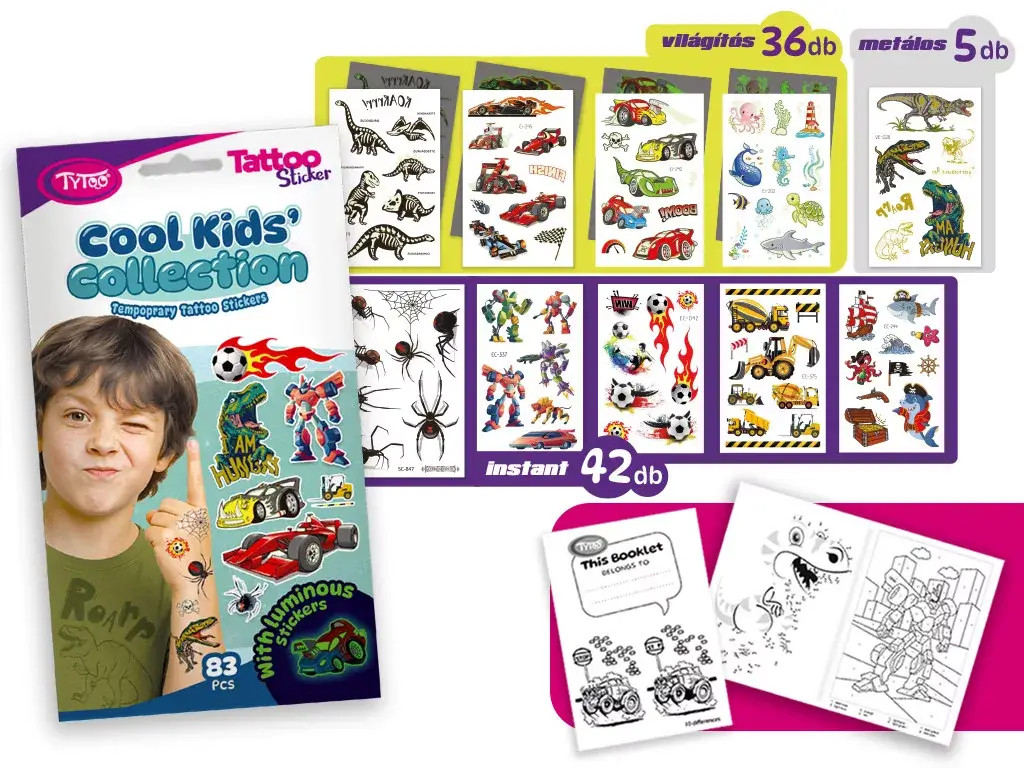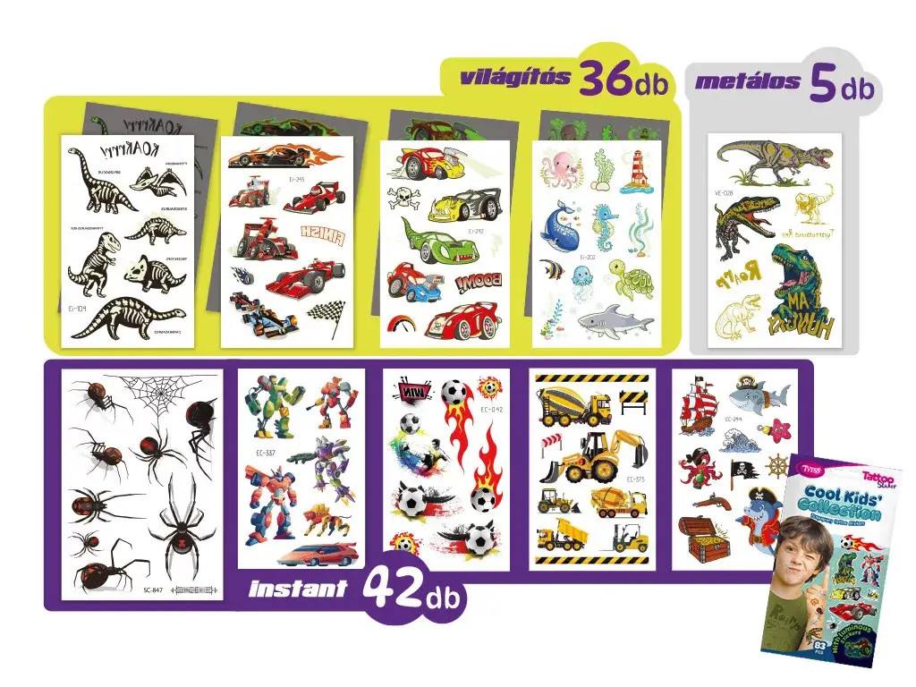Tele van versenyautókkal, dinoszauruszokkal, pókokkal, focilabdákkal, robotokkal, kalózokkal, munkagépekkel és tengeri szörnyekkel – világító, metálfényű és klasszikus tetkók várják azokat a srácokat, akik imádják az akciót, a kalandot és a kreatív játékot!