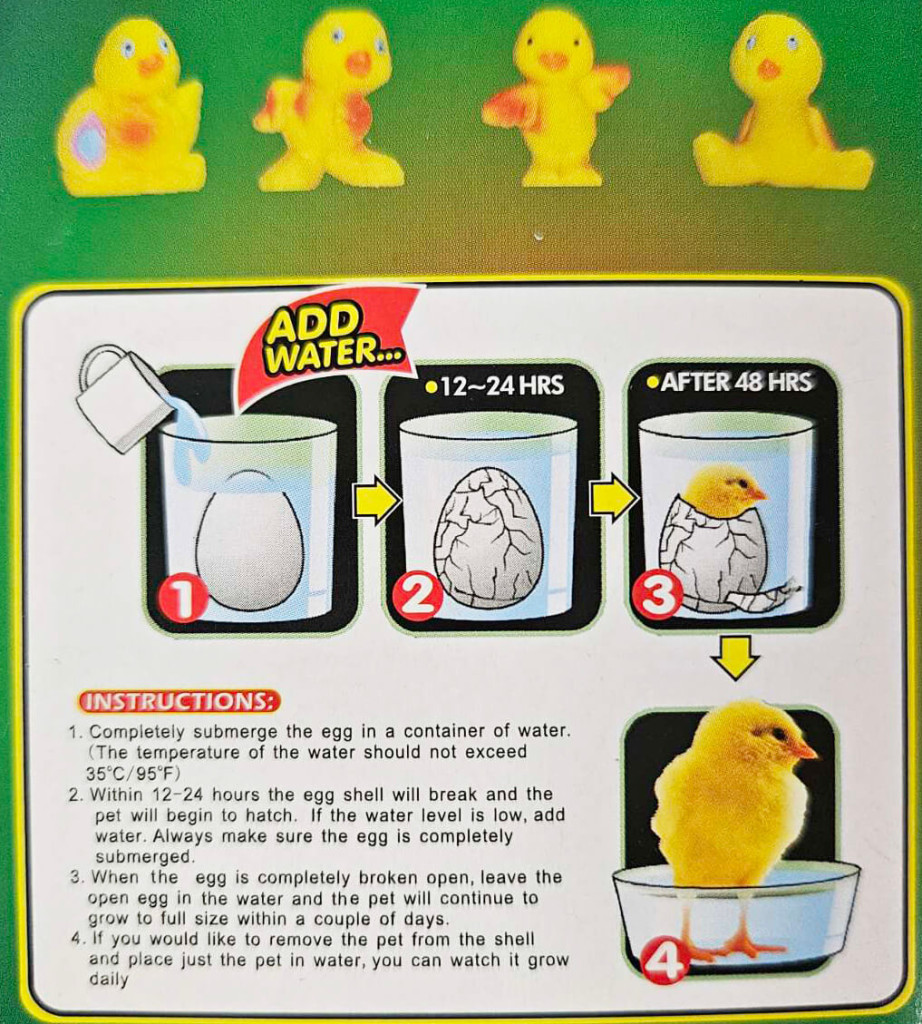 Tojásból kikelő és növekvő csibe, többféle. Tojás mérete 6cm. Vízbe kell tenni a tojást, hogy "kibújjon" a csibe. Az ár egy darabra vonatkozik, nem biztos, hogy mindegyik van készleten.