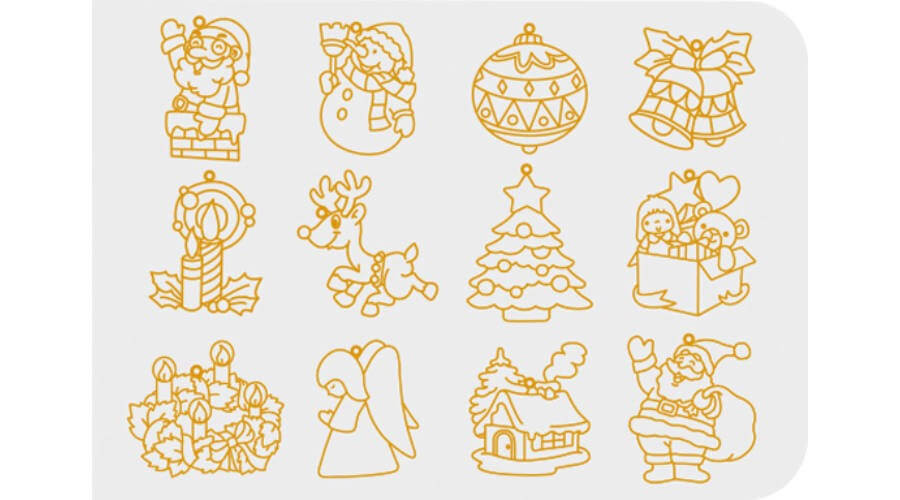 Karácsonyi nagy készlet 10 db 10,5 ml-es üvegfóliafestékkel és 12 db karácsonyi fényvarázsforma mintával, arany peremmel. Kétféle dobozzal van forgalomban.
